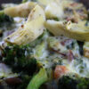 Mit Broccoli, Zucchini, Artischocken, Porree, frische Champignons, Tomaten & Zwiebeln mit Käse überbacken, dazu Brot.