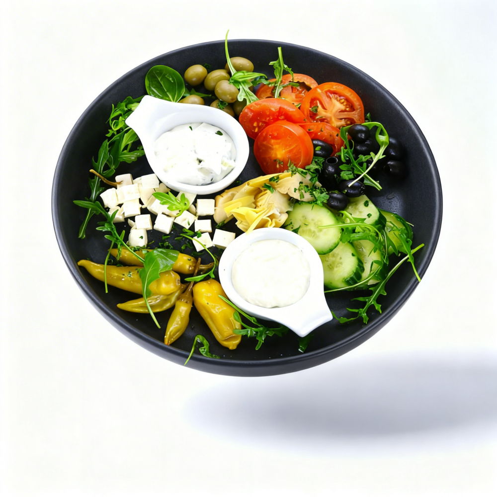 Mit eingelegtem Hirtenkäse, grünen Oliven, Peperoni, Gurken, Tomaten, dazu Tzatziki, Butter & Brot.