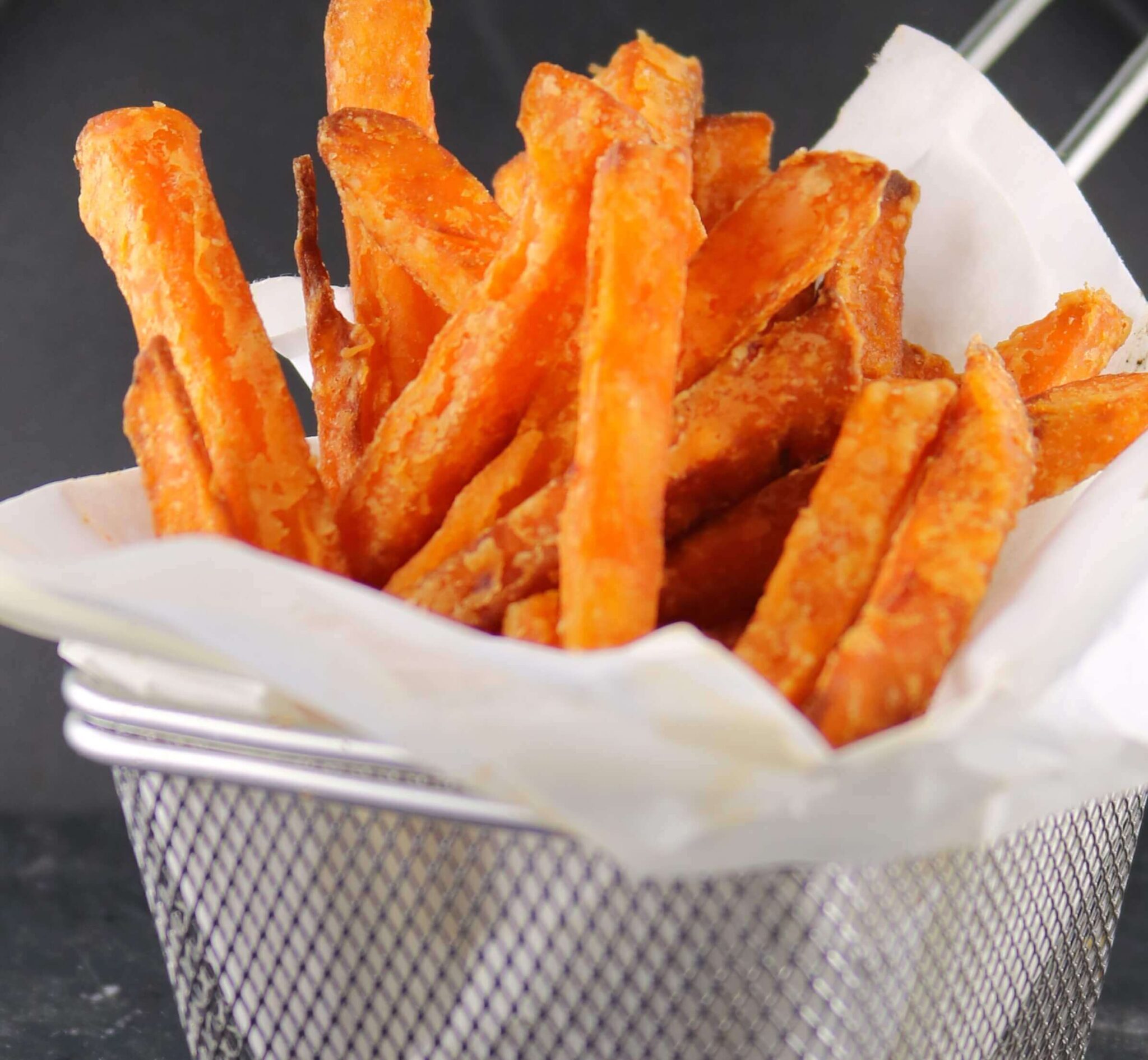 Gewürzte Süßkartoffel-Pommes mit Sour Cream.